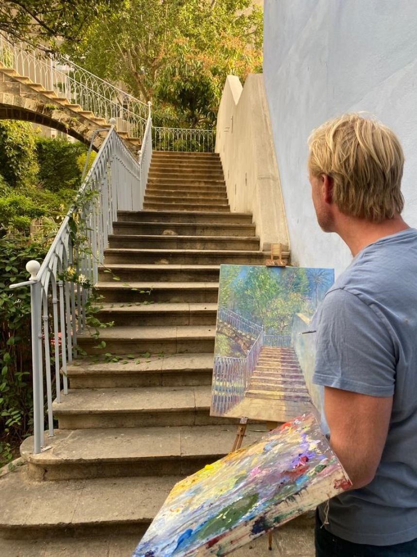 Petit coin d’Eden dans une jungle de béton, la maison est entourée d’un jardin où fleurissent des jacarandas et des jasmins, offrant une nature luxuriante propice à l’inspiration de l’artiste. Ce blond aux yeux bleus est chez lui dans cette ville qui a connu la déchéance et la gloire, sans répit, depuis des millénaires. Il peint les détails du lieu et tente de capturer leur essence. Une montée d’escalier, la façade de la villa, les détails du plafond avec ses dorures baroques, tout est matière à représenter.